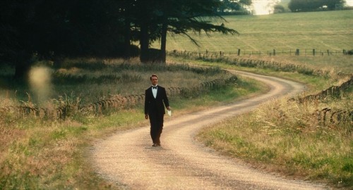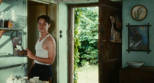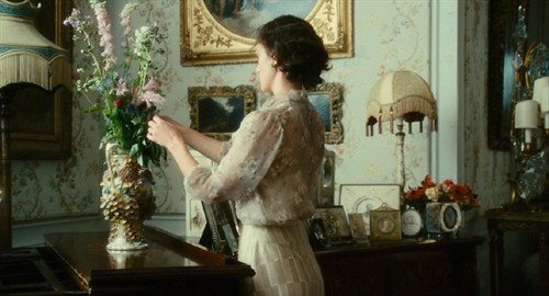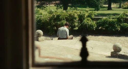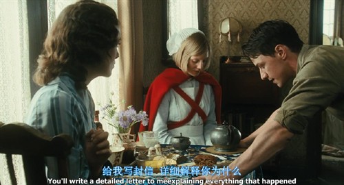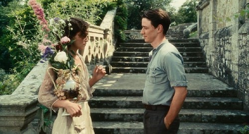 故事发生在20世纪三四十年代的英国。电影前半部分的地点是在美丽的乡村田园,这一部分的色彩和画面柔和明媚且充满诗意。无论是被野花绿地环绕的乡间城堡,还是屋内从壁纸、窗帘到沙发、陈设,甚至女主衣衫的各种碎花装饰,全部都充满了我极爱的田园气息。这部分有好几个画面令我难忘:姐姐塞西莉亚拿着花束在田间奔跑、妹妹布里奥妮坐在野花环绕的灌木丛中书写自己的小说,还有男主罗比在厨房里的恬然一笑……但正是在这样的浪漫气息中,炎热的盛夏似乎又焦灼着几个年轻人内心被压抑的欲望,闷热烦躁中还隐隐透露着一丝不安。