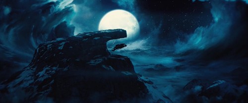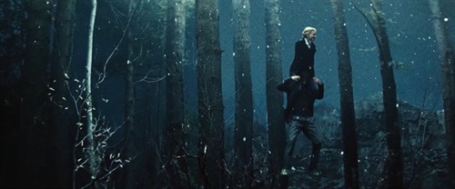 好吧,暂且抛开上面的疑惑,来看看男女主人公冲破法则走到一起后又发生了哪些匪夷所思的矛盾。左上这个画面是男主人公用绳子将女主人公从上层世界拖拽到下层(因为女的受上层世界的重力束缚),然后来到一片树林里玩耍,女的骑在男的肩上跳跃着前进,由于男的受下层世界的重力影响,且质量比女的要大,所以,两者受到的合外力同下层世界的重力方向相同,造成跳跃前进的情形看上去很像是在月球上行走。然而,令人蛋疼的是,影片后面,当男女主人公在山崖上约会并紧紧搂抱在一起的时候,居然是悬浮在半空中不停的打转,仿佛失去了重力(右上画面)。我那个去!