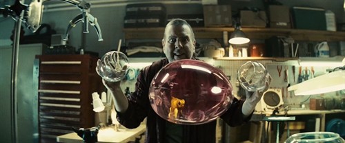 最后一点,上层的这位工程师和男主人公认识并成为朋友后不久便被公司解雇,但他因为给男主角创造了去见女主人公的机会,因而获得了男主角多年的科研成果。左上这个画面是工程师将来自两个世界的水混合后形成封闭水球并漂浮在空中,水球中的金鱼在水里游动的情形。啧啧,这金鱼难道跳不出这个封闭的水球吗?右上图,影片结尾处,工程师利用左上画面的发现和成果,在自己体内注入下层的某种液体,这样一来,即使不用专门的反物质,他也能来到下层世界,并且还展示了他可以很轻易的摆出优美的芭蕾舞姿。切!如果是这样,那单靠反物质去到对方世界的人,他体内的血液受他所在世界重力的影响,岂不是一直往脑袋上冲的?